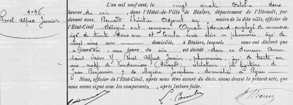 Acte de décès d’Alfred Revel du 24 octobre 1900 à Béziers ← Précédent Suivant → En savoir plus sur Une histoire languedocienne Abonnez-vous pour recevoir les derniers articles par e-mail. Saisissez votre adresse e-mail… Abonnez-vous
