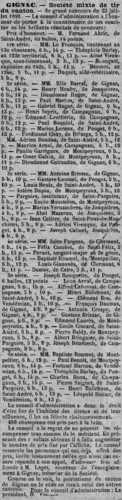 La République du Midi du 3 août 1893 publie les résultats du concours annuel de tir, organisé par la Société mixte de tir, qui s’est déroulé la semaine précédente à Gignac.